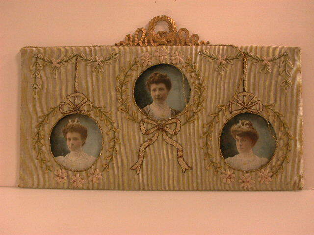 - BeschrijvingFotolijst met drie portretjes achter glas. Op achterkant metalen lauwerkrans en tweemaal de letter "M".