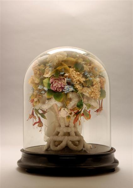 Grote ronde stolp op zwart gelakt houten plateau. Plateau op drie pootjes. In de stolp een vaas met bloemen.