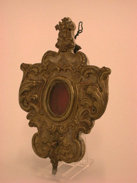 - BeschrijvingBarok verguld koperen schild. Lijst van krulwerk en sierbladeren, bekroond door een floraal kruis.