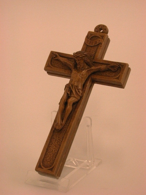 Kruis zonder voet met meegestoken corpus. Achterzijde: schuifje met 15 relikwieen van verschillende H.H.