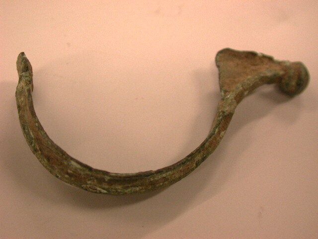 Aucissa-fibula met zwak geprofileerde doorsnede. Aan het eind van de voet is een knop. De schede is afgebroken. Bij de overgang van voet en beugel zijn 3 dwarsstreepjes. De beugel heeft een rug in de lengterichting met restanten van een versiering. Van de kop is maar een gedeelte over evenals spiraal en naald is het voorste gedeelte van de kop afgebroken. Beugel en voet samen gaan van een breedte van 9 mm aan de kop geleidelijk aan over tot 3 mm bij de knop van de voet. Groen door oxydatie, waardoor ook de hele figula enigszins ruw is.