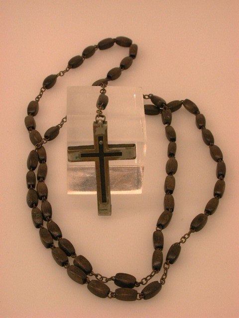 Zwart (ebben-) houten kruisje beslagen met metalen omhulsel dat aan achterzijde een smalbalkig kruisje vrijlaat, aan voorzijde het midden van de kruisbalken, waar het corpus ontbreekt. INRI-bordje en onderste nageltje zijn nog wel aanwezig. Opschrift: FRANCE onderaan. Glad houten donkerbruine rechthoekige kralen met convexe zijden. Na kruis 1 OV, 3 WG 1 OV, dan medaille van onbevlekte ontvangenis (zie 14319.14) met drie oogjes, dan rest van snoer: 5 tientjes, 4 OV, OV,WA en medaille van elkaar gescheiden door een kettinkje.