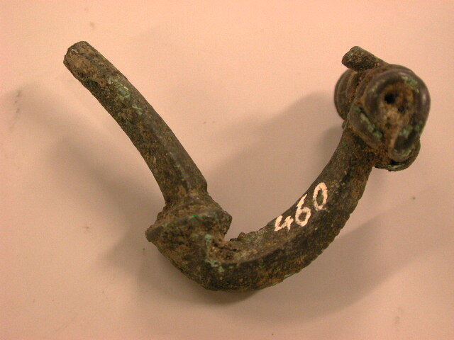 - BeschrijvingKnikfibula met haak en 2 steunplaatjes. Van de voet is een groot gedeelte, waaronder ook de hele schedehouder, afgebroken. De beugel is vrij dik en vierhoekig. Een ring scheidt beugel en voet die veel dunner is dan de beugel. De naald ontbreekt en de 8 windingen zijn sterk geoxydeerd.