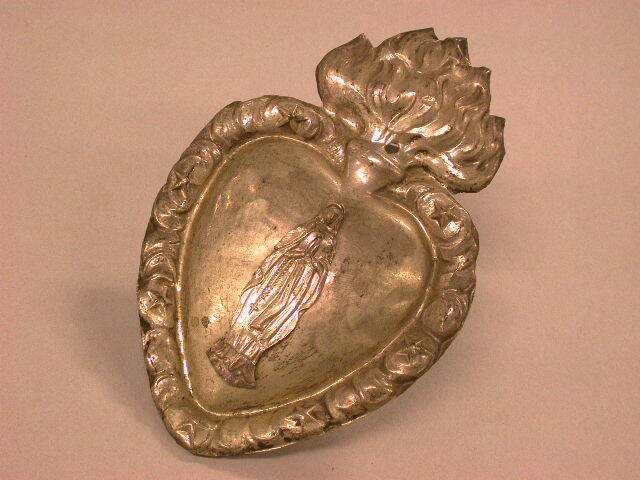 Vlammend hart omgeven door krans met vijfpuntige sterren. Reliëfafbeelding van Maria.