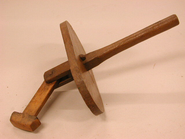 - BeschrijvingHet hamertje kan slaan op het houten plankje. De verschillende onderdelen zijn met houten pennen bevestigd en met 1 ijzeren pen. Een klepper werd gebruikt door een dorpsomroeper.