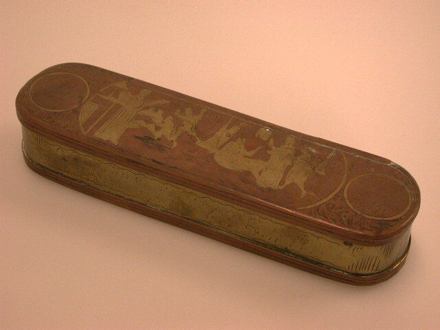 - BeschrijvingHet deksel van de tabaksdoos is gemaakt van roodkoper, alsmede de bodem. De wanden zijn van geelkoper. Het deksel en de bodem zijn gegraveerd en ingelegd met koper.