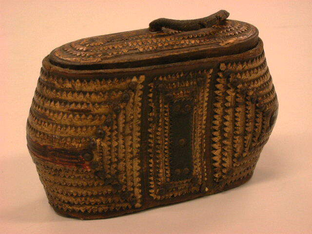- BeschrijvingSnuifdoos met afgeronde korte zijden. Versierd met over elkaar liggende in maat aflopende van kartelrand voorziene vastgenagelde stukjes leer. Deksel idem met leren veter als handvat.