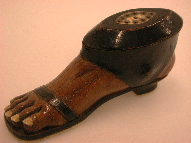 - BeschrijvingSnuifdoos in de vorm van een voet in een sandaal. Iepehout, gesneden met benen hak en zool, bevestigd met koperen nageltjes. In de zool zitten twee dobbelsteentjes achter glas.