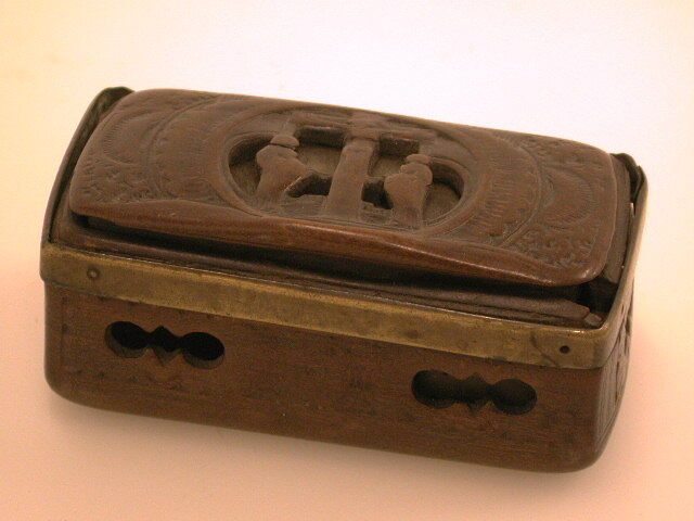 - BeschrijvingNotenhout, gesneden met geelkoperen lijst. Het deksel en de wanden zijn opengewerkt. Op het deksel staat de Golgotha scene.