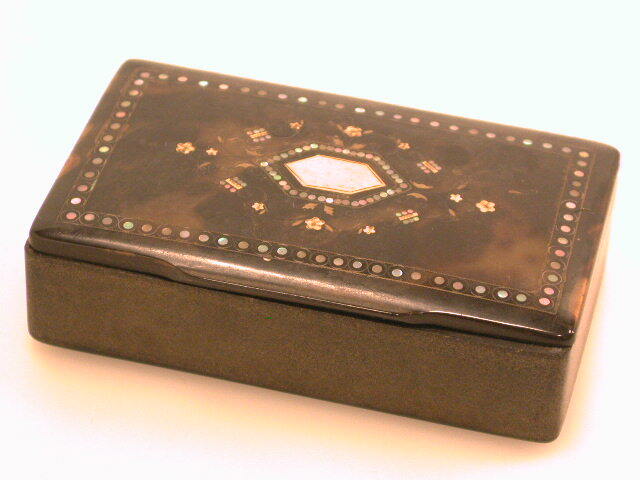 Een vierkante doos ingelegd met parelmoer en goud. De snuifdoos heeft een cartouche met florale en geometrische motieven.