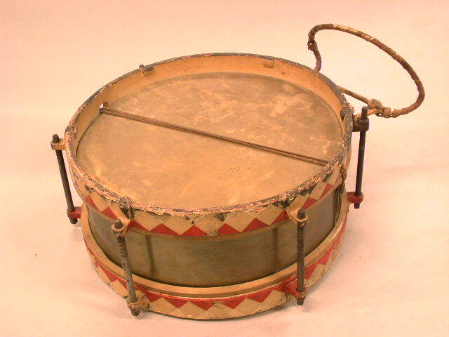 - BeschrijvingKleine trom met over de gehele diagonaal een gespannen snaar. De trom is in het midden groen geschilderd en de randen zijn voorzien van rode driehoekjes. Het vel is gespannen met zes moeren.