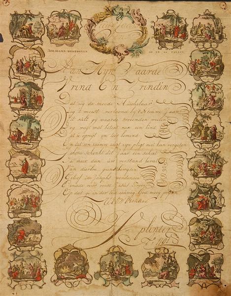 - BeschrijvingNieuwjaarswens omlijst met kleine gravures met voorstellingen van Abrahams reisgenoten op hun tocht van en naar KanaƤn.