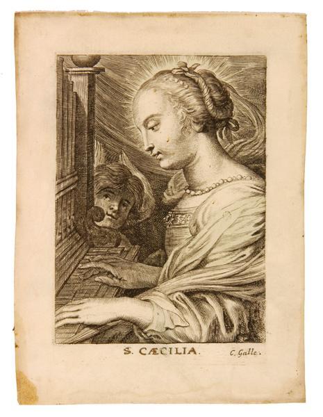 - BeschrijvingVoorstelling: Heilige Cecilia ten halve lijve naar links en profile. Haar blik is gericht naar het klavier van het orgel waar zij op speelt.