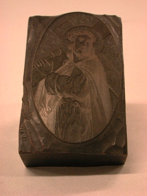- BeschrijvingDrukblok met voorstelling van de kruisdragende, met doornen gekroonde Christus.