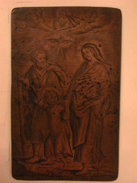 Plaat voor het afdrukken van een devotieprent. Voorstelling: Jozef en Maria lopen met tussen hen in het Christuskind. Ze gaan barrevoets. Boven hen vliegt de heilige geest in de gedaante van een duif. Daarboven is God de Vader zichtbaar temidden van wolken. Hij heeft een globe in de hand met daarop een kruis. De tekst luidt: "IESUS. MARIA . JOSEPH".