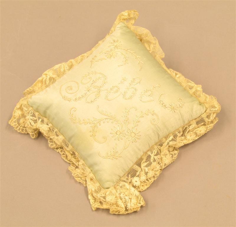 - BeschrijvingBlauwgroen speldenkussen voor babykamer. Bovenkant van zijden satijn, geborduurd met witte zijde. Bloemenranken waartussen het opschrift "Bébé". Onderzijde kant van blauwgroene katoenen satijn. Omrand met een brede strook creme tulekant met machinaal borduurwerk.