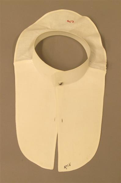 - BeschrijvingZeer hard gesteven wit katoenen front. Hoge, rechtopstaande boord met knoopsgaatjes middenvoor, achter en op het borststuk. Gesloten met een boordeknoopje.