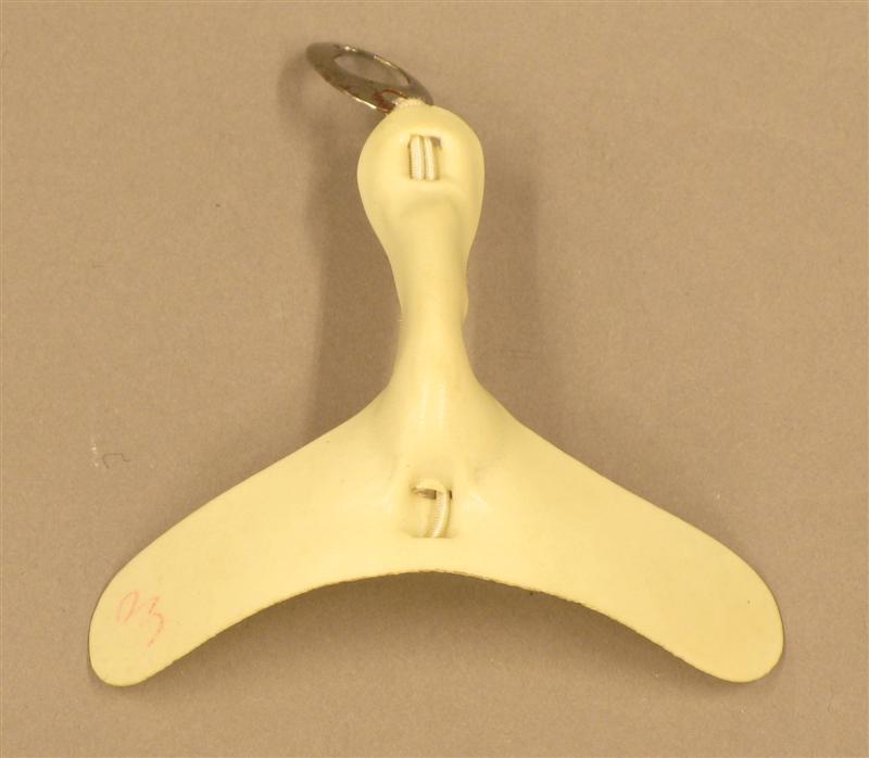 - BeschrijvingBidelot van kunststof en metaal. Elastiekje met metalen plaatje met knoopsgat. Het metalen plaatje werd aan de boordeknoop bevestigd