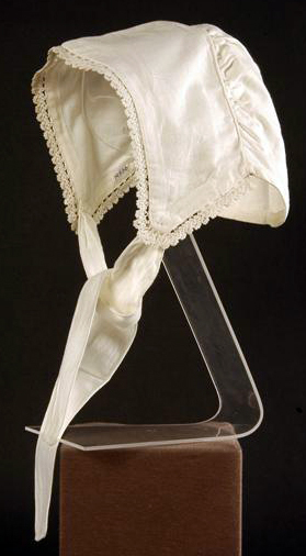 Witte katoenen muts. Brede pas, kleine bodem. Langs onderrand bodem een tunneltje met 2 doorgeschoven bandjes. Pas afgezet met wit gehaakt kantje. 2 kinstrikken