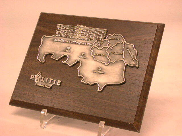 Twee aluminium appliqué's op en drager van MDF, kunststof gefineerd. De bovenste aluminium appliqué heeft de vorm van de kaart van Noord-Brabant met o.m. de grenzen van de politieregio Brabant-Noord en de daartoe behorende districten. Aan de bovenzijde van deze kaart een afbeelding van de voorgevel van het in 1994 geopende Hoofdbureau Orthenpoort te 's-Hertogenbosch. De aluminium appliqué linksonder geeft het beeldmerk van de politie: de tekst 'POLITIE/.Brabant-Noord'. De letter O van politie heeft aan de bovenzijde een wetboek en een fakkel, respectievelijk de symbolen van de gfuseerde Gemeente- en Rijkspolitie. Aan de achterzijde van de drager zijn twee sleufjes gefreesd, ter bevestiging van de plaquette aan de wand.