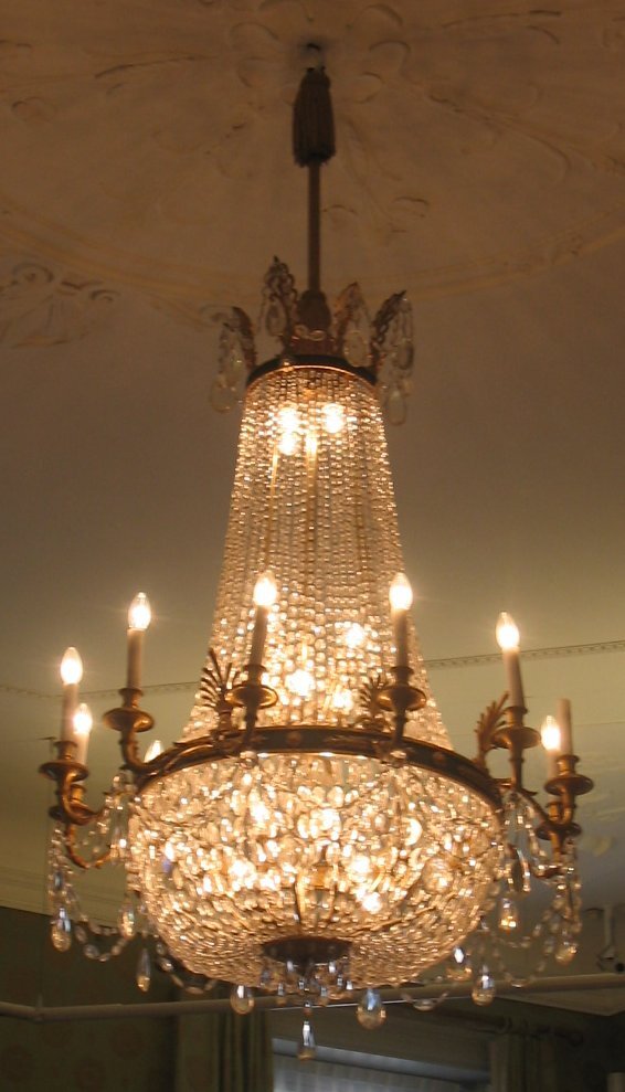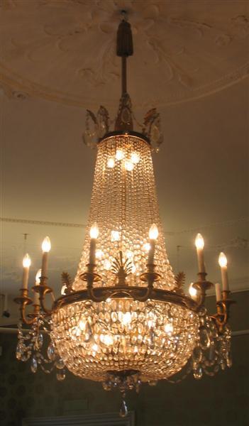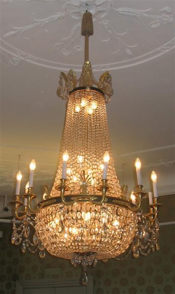 - BeschrijvingLichtkroon, verguld en gepatineerd brons en geslepen glas.