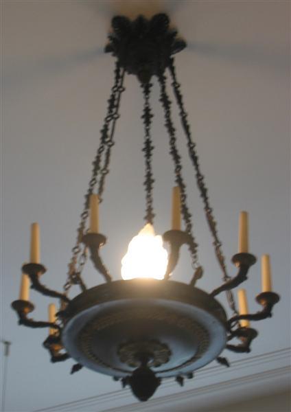 - BeschrijvingLichtkroon van gepatineerd en verguld brons, glazen kap.