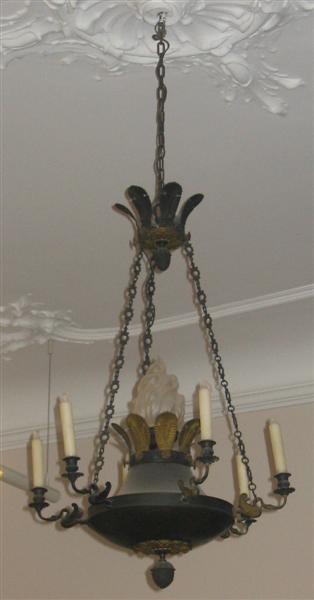 - BeschrijvingLichtkroon met zes armen, van deels verguld brons. Met glazen kap.
