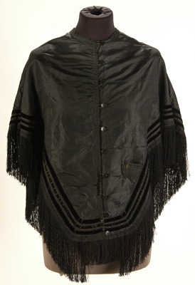 - BeschrijvingZwarte zijden pelerine, afgezet met zijden franje. Langs de randen drie fluwelen bandjes. Op linker voorpand klein zakje. Gevoerd met naturelkleurige bruine katoen. Lipje op de voering van de rug. Sluiting met tien knoopjes en lusjes.