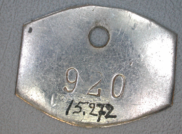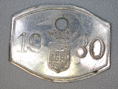 - BeschrijvingHondenpenning in de vorm van een liggende rechthoek met bolle boven- en onderzijde Vz: gekroond stadswapen van 's-Hertogenbsoch met links daarvan '19' en rechts '30', verdikte rand kz: '920'