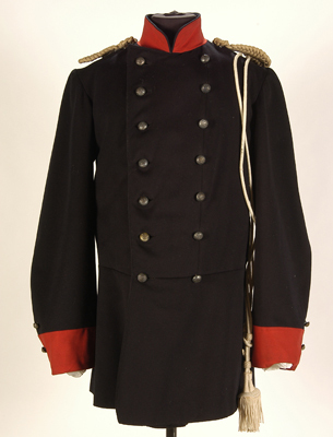 - BeschrijvingUniformjas met schoudertressen en nestels, van een officier van de dienstdoende schutterij van Waalwijk, ca 1900. Model 11 maart 1869 (vgl. inv.nrs. 11747.047 en 11747.059).