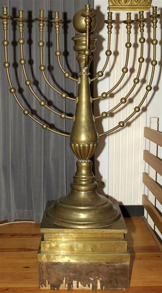 - BeschrijvingEen monumentale bronzen synagogale Chanoeka- kandelaar, vermoedelijk Nederlands, 19de eeuws, op lange taps toelopende stam, met acht geknopte armen en bijbehorende dienaar (zg. shammash). De kandelaar is afkomstig uit de Nederlands- Israelitische Hoofdsynagoge aan de Prins Bernhardstraat te 's-Hertogenbosch