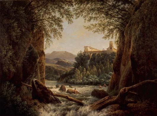 - TitelItalianiserend berglandschap met rivier en enkele baders