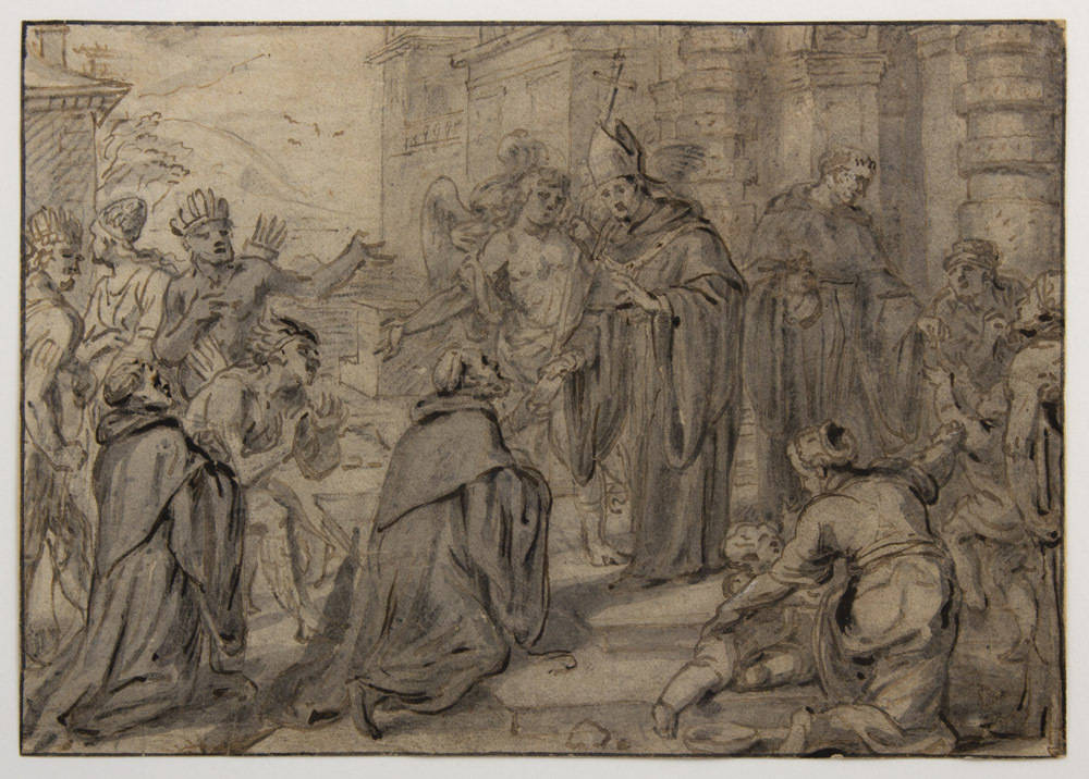 In het midden van de voorstelling staat een bisschop met een mijter op. Hij neemt een brief in ontvangst van een pater die vóór hem geknield ligt. Naast de bisschop een engel met een kruisstaf. Verdere aanwezige figuren zijn: een pater, een drietal mannen met veren getooid en met pijlenkokers op de rug, en een vrouw (rechts). Een pater met een geldbuidel die bedelende mannen en een vrouw met twee kinderen een aalmoes geeft. Op de achtergrond is een gedeelte van een kerk te zien.
