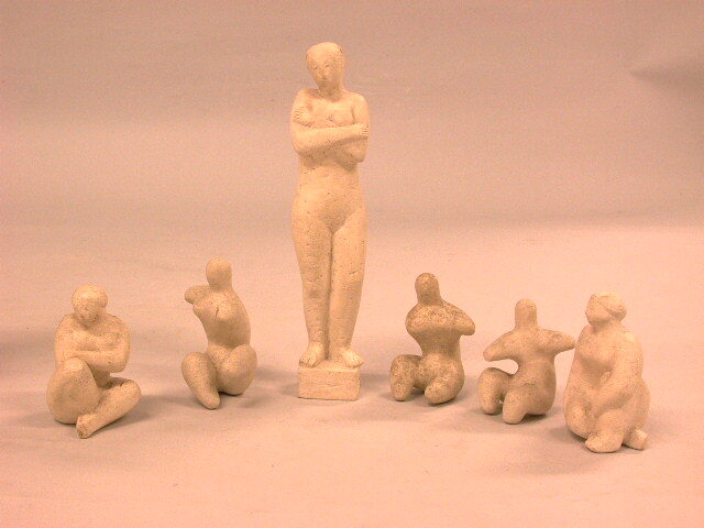 Vijf zittende en één staand vrouwenfiguurtje
