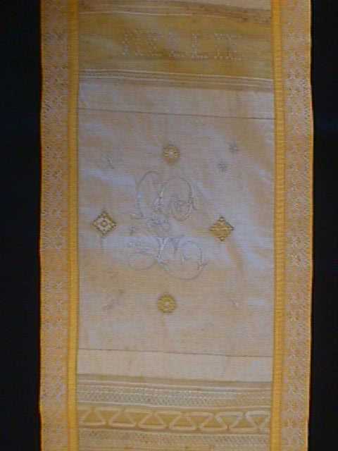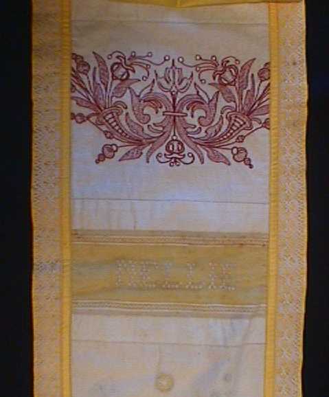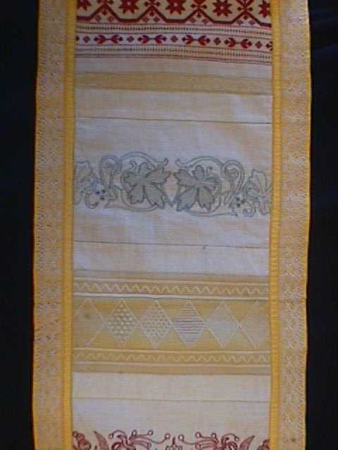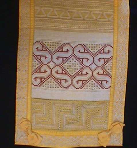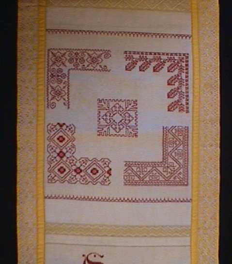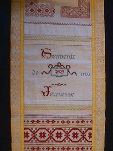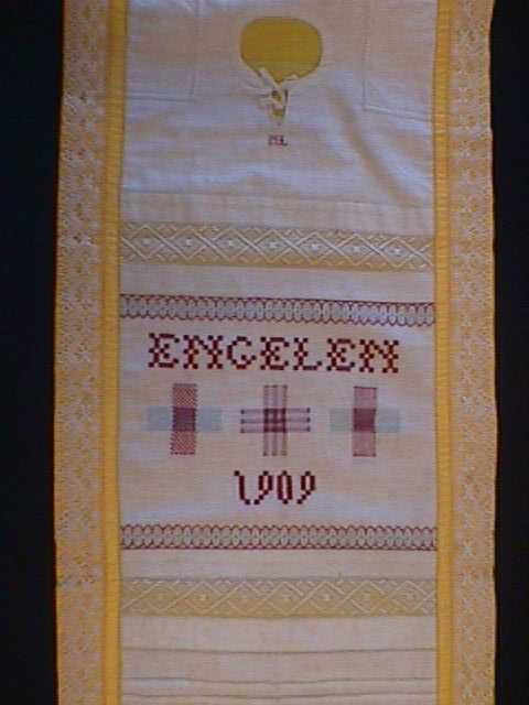 Langwerpige lap waarop 14 stukken stof te zien zijn die aan elkaar zijn gestikt. Op ieder stukje is een naai-, borduur-, stop-, of stiktechniek gemaakt. Het geheel is omrand door een kanten rand. Op de vier heoeken is een geel, zijden strikje bevestigd. De veertien stukken stof zijn aan elkaar gemaakt en op een ondergrond van gele zijde gestikt.