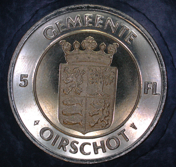 - BeschrijvingVoorzijde: een zelfportret van de pijprokende Oirschotse kunstenaar Jan Kruysen met twee kruisjes. Keerzijde: het wapen van de gemeente Oirschot.