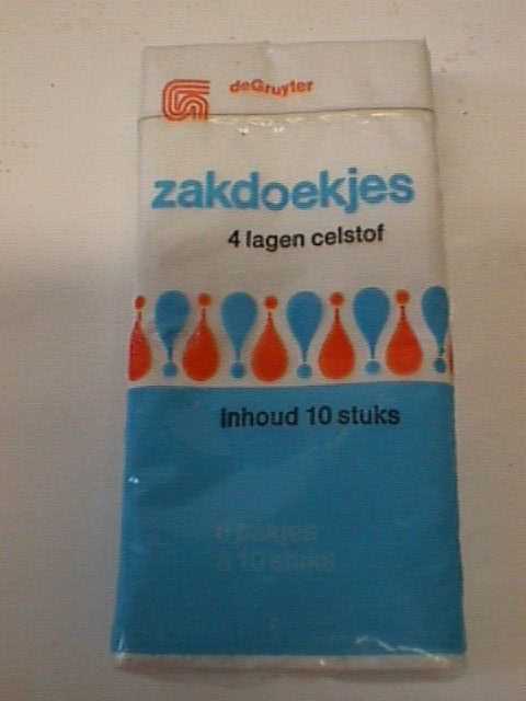 - BeschrijvingPlastic verpakking met daarin papieren zakdoekjes. De verpakking is blauw met blauwe en oranje druppels. Een deel van de verpakking is transparant. Op de verpakking staat het De Gruyter logo van na 1972.