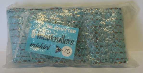 - BeschrijvingZak van doorzichtig kleurloos plastic met daarin zes blauwe krulspelden, zes insteekpinnen en een kartonnen etiket.