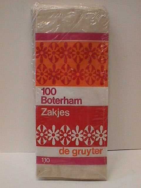 - BeschrijvingPlastic zak met daarin een papieren etiket en 100 papieren boterhamzakjes. Op het etiket staan rode en oranje bloemen tegen een oranje achtergrond en witte en rode bloemen tegen een rode achtergrond.