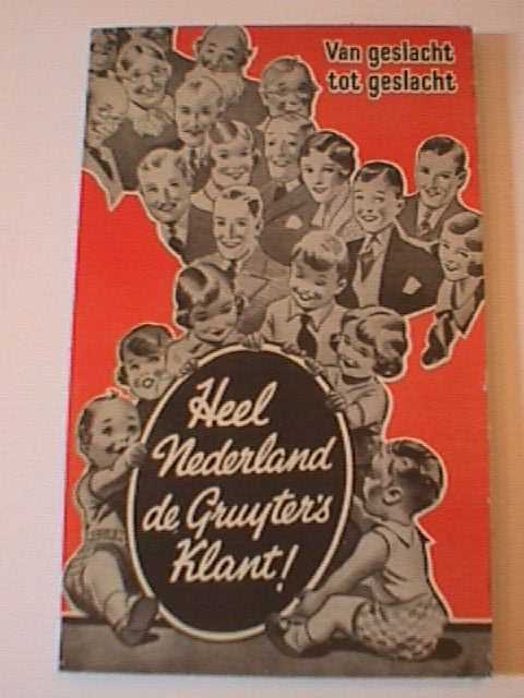 - BeschrijvingOpgeplakte kleurenkopie van De Gruyter reclame met de tekst VAN GESLACHT TOT GESLACHT, HEEL NEDERLAND DE GRUYTER'S KLANT. Afgebeeld staan 21 personen in de leeftijd van baby tot bejaarde.