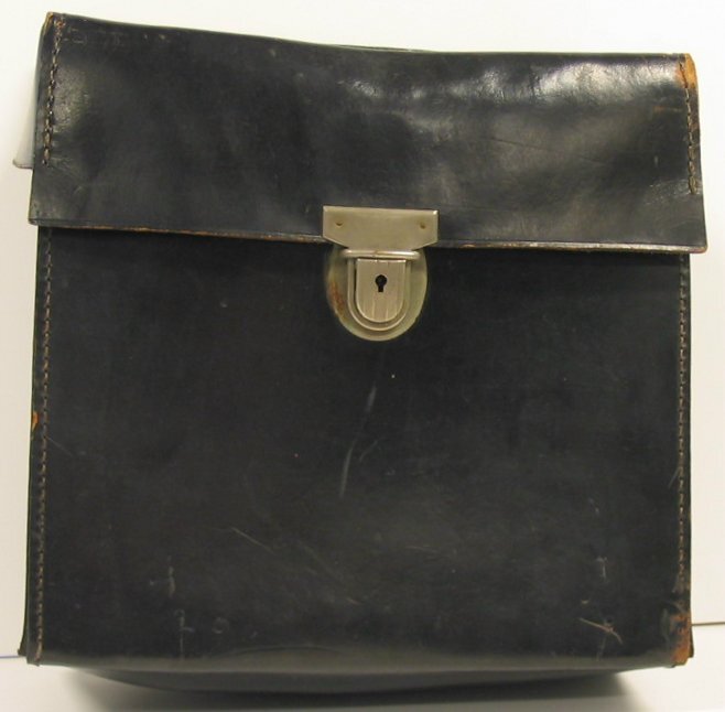 - BeschrijvingVerstevigde fietstas van zwart leer met metalen sluiting, ophang-strook en vastmaakriem. Vrij vierkant model. Waarschijnlijk gebruikt door de bezorgdienst. De naam De Gruyter ontbreekt.