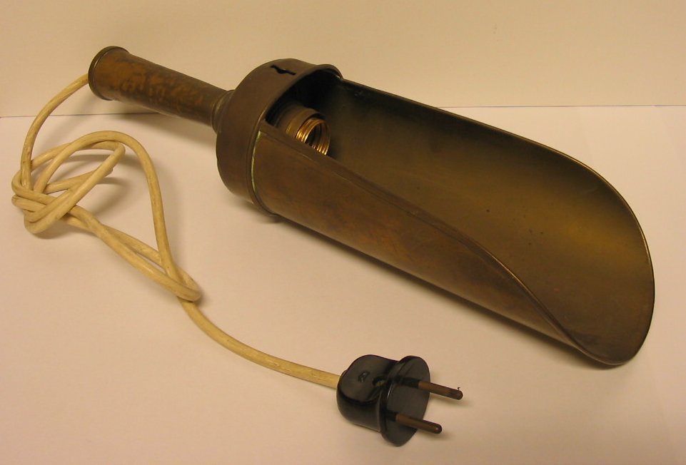 - BeschrijvingMetalen schep met handvat. Van de schep is een lamp gemaakt. Uit het handvat komt een snoertje en in de schep zit de fitting.