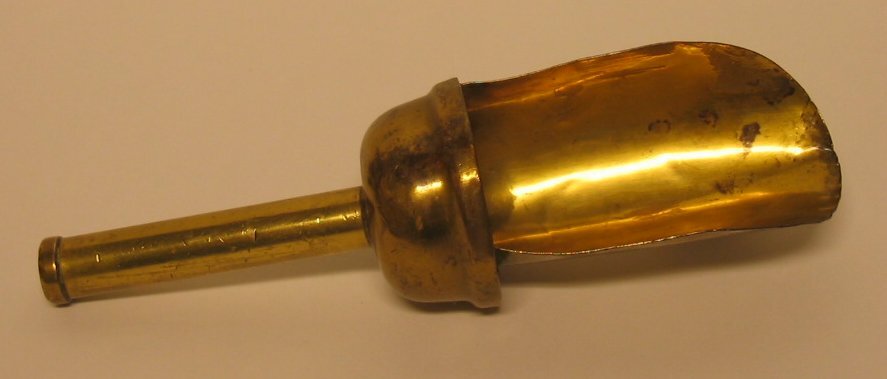 Koperen ronde schep met handvat, bestaande uit drie delen.