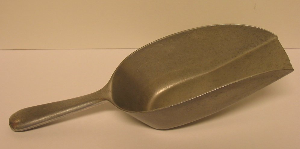 Metalen schep met een hoekige vorm en met een aan de schep gegoten steel.