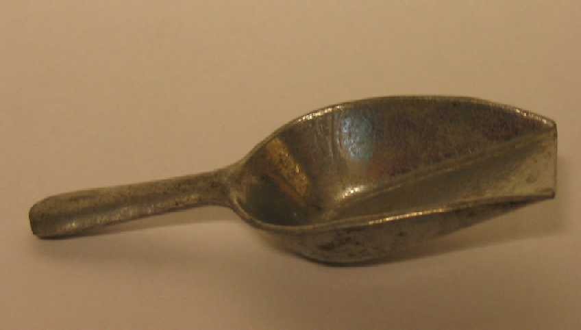 Metalen schep met een hoekige vorm en met een aan de schep gegoten steel.