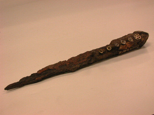 IJzeren dolkmes met houten heft, dat bevestigd is door zes bronzen kokervormige nietjes, waarvan het bovenste, tevens het grootste, versierd is met zes halve rondjes rondom een middelste rondje. De kop van het heft is voorzien van een dubbel bronzen randje, dat in het hout gestoken is. Waar de botte kant van het mes in het heft zit, is de eerstgenoemde versierd met een motief van rechte en schuine bronzen streepjes (plaatjes), die gedeeltelijk losgelaten en verdwenen zijn. Op de afscheiding van heft en lemmet steekt aan een zijde nog de helft van een ijzeren pareerknop