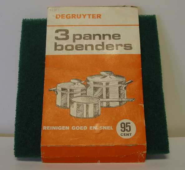 - BeschrijvingKartonnen oranje verpakking met een afbeelding van een steelpan en twee kookpannen. In de verpakking zit een donkergroene panneboender gemaakt van schuurwol.