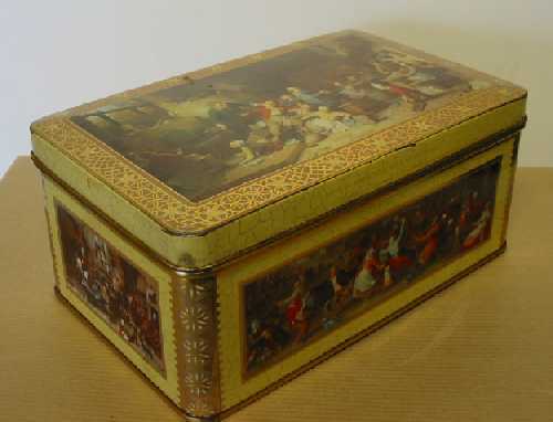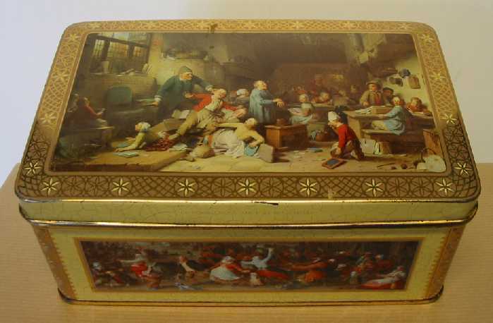 Rechthoekig goud- en geelkleurig met craquelemotief, metalen voorraadblik met vijf afbeeldingen van genreschilderijen. Op het deksel: De dorpsschool van F. de Braeckeleer. Op de voor- en achterkant: Dorpskermis van David Vinckboons. Op de zijkanten: Interieur met boeren van Corn. Dusart. Het voorraadblik heeft een scharnierend deksel.