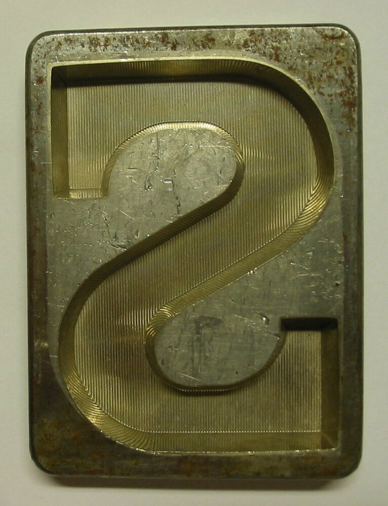 - BeschrijvingRechthoekige metalen vorm bestaande uit een plat vlak met daarin de letter S uitgediept.