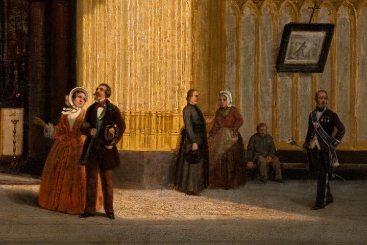 - BeschrijvingGezicht vanuit het Zuidertransept op het 17de eeuwse klassicistische oxaal. In 1868 werd het verkocht aan het Victoria and Albert Museum in Londen, waar het nog steeds te zien is. Links van het oxaal het Maria-beeld onder een baldakijn. Dit beroemde beeld keerde in 1853 naar 's-Hertogenbosch terug..